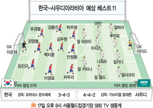 본프레레 감독은 “사우디아라비아의 밀집수비를 무너뜨리고 상대의 역습을 무력화시킬 것”이라고 말했다. 그는 “국내파나 해외파를 가리지 않고 컨디션을 감안해 투입하겠다”고 덧붙였다.