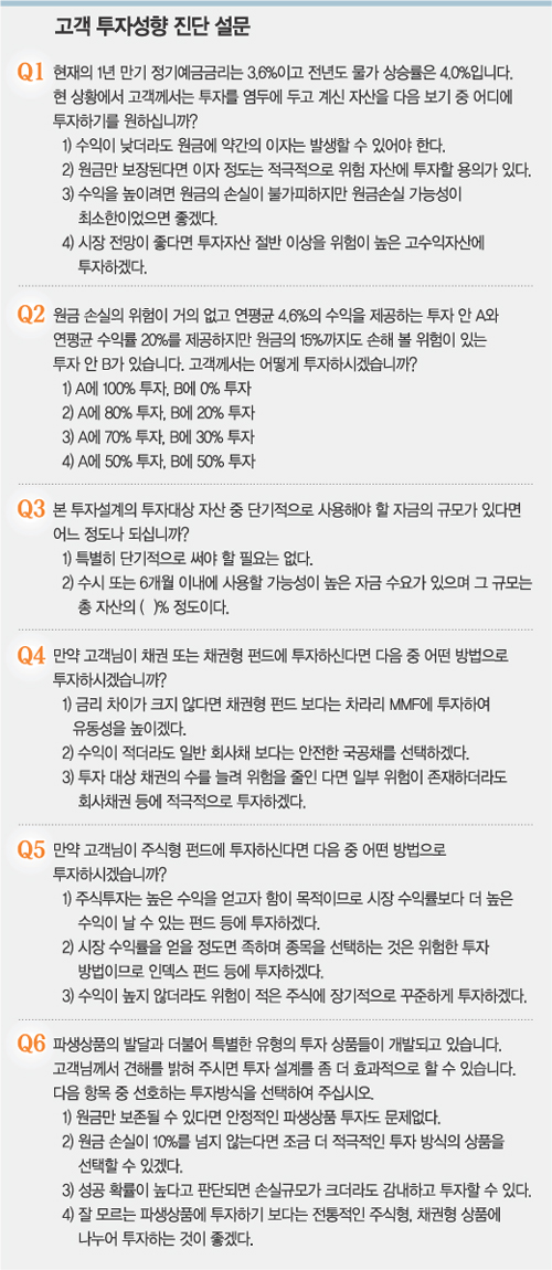 예컨대 설문은 ‘1년 만기 정기예금 금리는 3.6%이고 전년도 물가상승률은 4.0%인 상황에서 다음 중 자산을 어디에 투자하겠나’와 같은 질문으로 이뤄져 있다. 이런 설문을 토대로 컴퓨터는 고객을 보수형, 안정형, 중립형, 적극형, 공격형 등 5가지 유형으로 나눈다.▶표 참조