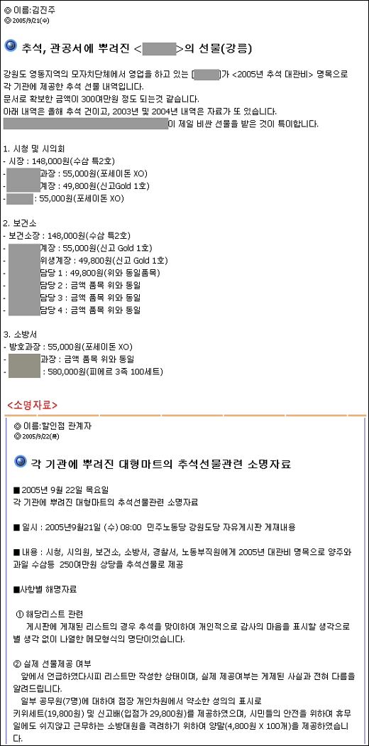 민주노동당 동해삼척지역위원회 김진주 사무국장은 지난 21일 민노당 강원도당 홈페이지에 글을 올려 “대형할인마트사가 강릉지역의 시청과 경찰서, 보건소, 소방서, 노동부, 언론사 등에 대규모 추석선물을 돌렸다”고 폭로하고 선물내역을 낱낱이 공개했다.
