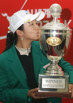 신세계배 제27회 한국여자프로골프(KLPGA) 선수권대회 정상에 오른 배경은이 우승컵에 입을 맞추고 있다. 사진 제공 KLPGA