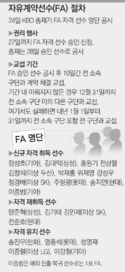 한국야구위원회(KBO)는 24일 장성호(기아) 박재홍(SK) 등 올해 FA 자격을 신규 취득한 12명과 양준혁 등 두 번째 자격 취득 선수 4명, 염종석(롯데) 등 자격 유지자 5명 등 총 21명의 명단을 각 구단에 공시했다.