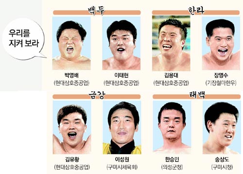현대삼호중공업의 아성에 구미시체육회를 비롯한 여타 선수단이 도전하는 형태다. 최중량급인 백두급에서는 이태현(현대삼호중공업) 김경수(기장철마한우) 등 전통의 강자와 하상록 박영배(이상 현대삼호중공업) 강성찬(구미시체육회) 등이 각축을 벌일 것으로 보인다.