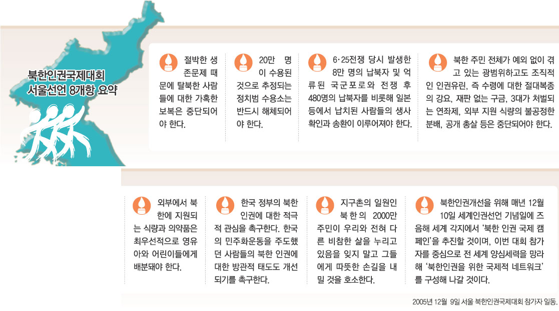 ▽“중국의 탈북자 정책은 유엔협약 위반”=마이클 호로위츠 미 허드슨연구소 선임연구원은 이날 대회 두 번째 행사로 열린 ‘북한인권개선전략 회의’에서 “고국에 돌아갈 경우 박해를 받게 될 사람은 어떤 일이 있어도 송환하면 안 된다”며 “탈북자를 북한으로 내모는 중국은 완벽하게 유엔협약을 위반하고 있다”고 비난했다.