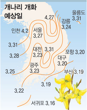 기상청에 따르면 개나리는 3월 16일 제주 서귀포에서 개화하기 시작해 △남부 지방은 3월 19∼23일 △중부 및 동해안 지방은 3월 24∼30일 △중부내륙 산간 지방은 3월 31일에 꽃이 필 전망이다. 서울의 예상 개화일은 3월 27일로, 지난해 개화일인 4월 6일보다 열흘이나 앞당겨질 것이라고 기상청은 밝혔다.