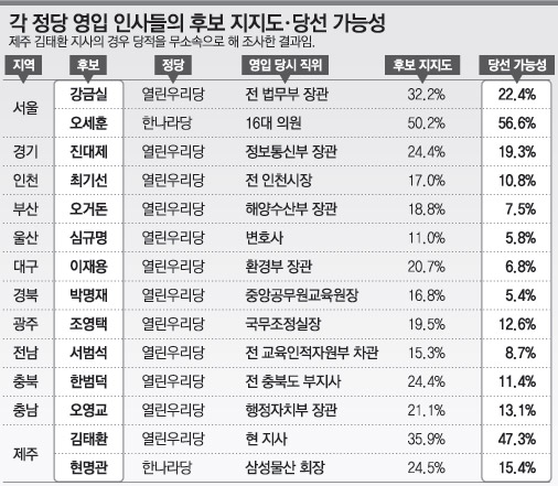 그러나 최기선(崔箕善·인천) 심규명(沈揆明·울산) 조영택(趙泳澤·광주) 서범석(徐凡錫·전남) 오영교(吳盈敎·충남) 후보는 후보 지지도가 해당 지역의 정당 지지도만도 못했다. 이들은 당명을 밝히지 않은 인물 선호도 조사에서 모두 10% 이내를 기록했다.