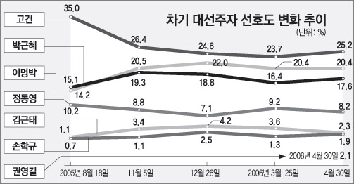 그러나 이명박(李明博) 서울시장은 2월 25.1%에서 3월에 20.4%로 떨어져 상승세가 꺾이면서 고 전 총리에게 1위를 내준 뒤 이번 조사에서도 20.4%에 머물렀다.