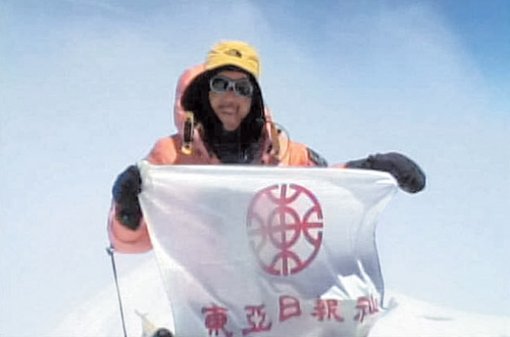 세계 최고봉 에베레스트 정상에 13년 만에 다시 선 박영석 씨가 동아일보 사기를 펼쳐 보이고 있다.