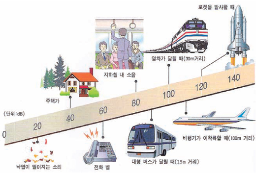 소음의 세기는 소음계로 측정한다. 소음계는 소음의 세기를 전기 신호로 변환시켜 계기판에 나타나도록 한 것이다. 소음계에 나타난 소음은 dB(데시벨)로 나타내는데, 10dB은 우리가 들을 수 있는 가장 작은 소리인 0dB보다 10배 큰소리이다. 20dB은 10dB보다 10배 큰소리이며 0dB보다 100배 큰소리이다. 다음 그림은 우리 주변에서 발생하는 여러 가지 소음의 크기를 나타낸 것이다.