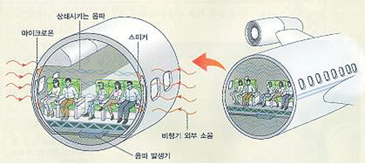비행기 속의 엔진은 사람들에게 피곤함을 더해 주고, 장거리 여행인 경우에는 청각에 문제를 일으킬 수도 있다. 그래서 다음 그림과 같이 비행기 속의 소음을 줄이기 위하여 새로운 음파를 발생시켜 상쇄 간섭시키려고 노력한다. 소음을 줄이기 위해 발생시키는 새로운 음파는 비행기 속의 소음과 어떤 관계가 있는지 생각해 보자.