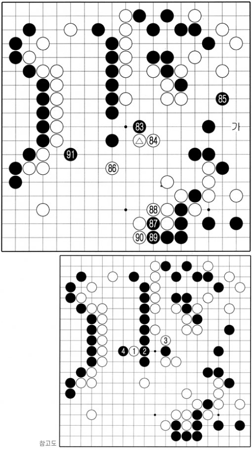 백 △의 공격에 이어 86 씌움 당할 것을 알면서도 흑은 85로 우변을 지키고 보았다. 백 ‘가’의 태클이 두렵기 때문이다. 그만큼 다급하다는 얘기다. 중앙 흑대마가 풍전등화의 처지인데도 이현욱 6단은 87, 89로 계속 승부수를 던진다.