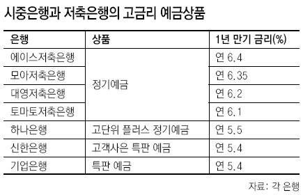 예금금리가 높은 곳은 단연 저축은행. 1년 만기 정기예금의 금리가 연 6%대로 속속 진입하고 있다.