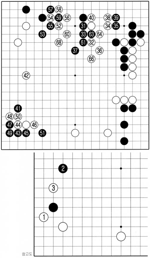 흑 41로 귀에 걸쳤을 때 백 42의 협공은 좀 헤프다는 평. 참고도 백 1로 타이트하게 흑을 압박할 필요가 있었다. 만약 흑 2로 뛴다면 즉각 3으로 침입해 흑을 괴롭힌다. 그러나 염정훈 5단은 실리를 짜게 챙기기보다 유연하게 흘러가고자 한다. 그러나 실리파인 박 9단은 귀를 도려내며 기분 좋은 표정이다.