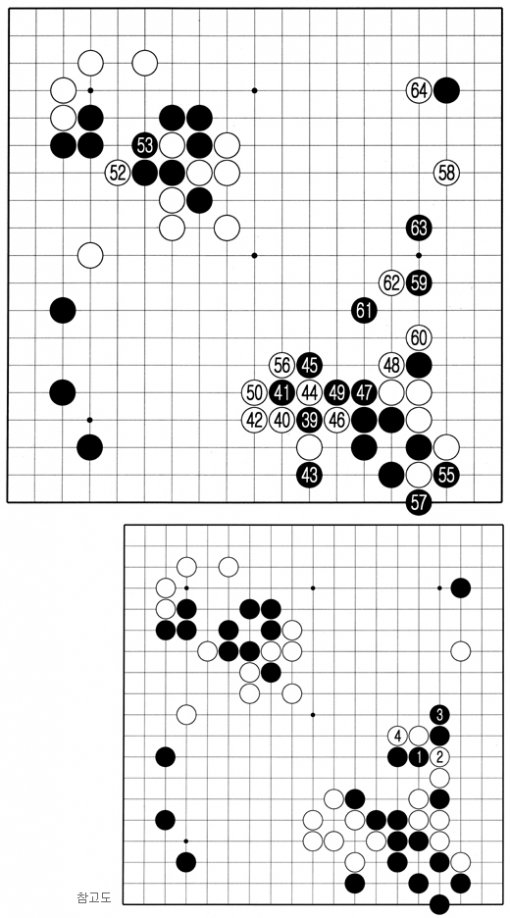 백 62로 붙일 때 흑 63으로 슬쩍 비킨 수도 신예들의 침착함을 보여 준다. 만약 참고도의 흑 1로 두면 백 4까지 흑이 불리한 싸움.