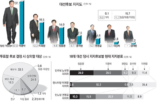 2002년 대선 당시 민주당 노무현 후보 지지자 중에서는 정 후보(24.0%)보다 오히려 이명박 후보(28.0%)를 찍겠다는 사람이 오차범위이긴 하지만 더 많았다. 이 전 총재(11.4%) 문 후보(9.3%) 등으로도 분산됐다. 당시 한나라당 이회창 후보를 찍었다고 밝힌 응답자 중 55.2%는 올해 대선에서 이명박 후보를, 24.4%는 이 전 총재를 찍겠다고 밝혔다. 정 후보 지지는 2.6%에 그쳤다.