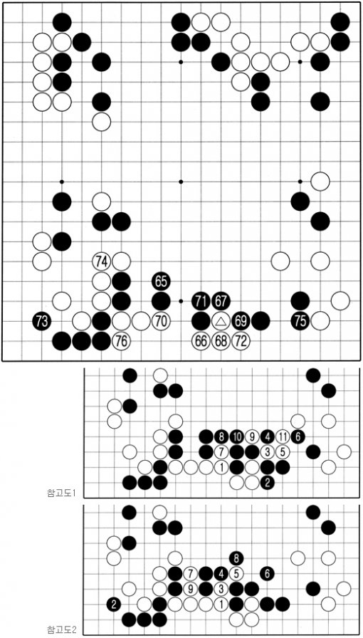 그러나 다음 수인 백 72가 검토실의 열기에 찬물을 끼얹었다. 백 72는 백의 삶에 도움을 주는 수도, 흑을 공격하는 수도 아닌 두 집 짜리 끝내기에 불과했다. 백 72는 당연히 참고 1도 백 1에 둬야 했다. 만약 흑이 2에 두면 백 3으로 끊는 것이 강력해 백 11까지 오른쪽 흑이 죽는다. 따라서 흑은 참고 2도 흑 2로 두는 것이 정수인데 백은 9까지 흑 두 점을 잡아 유리함을 이어갈 수 있었다.