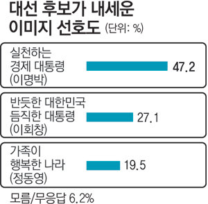 ‘후보들이 내세운 이미지 가운데 어느 것이 가장 마음에 드느냐’는 질문에 전체 응답자 가운데 절반에 가까운 47.2%는 한나라당 이명박 후보가 내세운 ‘실천하는 경제대통령’을 꼽았다.