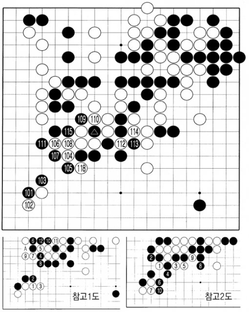 그나마 백 102로 한번 젖혀 놓는 게 좌하 수습에 도움이 된다. 백 102를 생략하고 그냥 중앙을 보강하면 귀의 백이 제압당하기 때문.