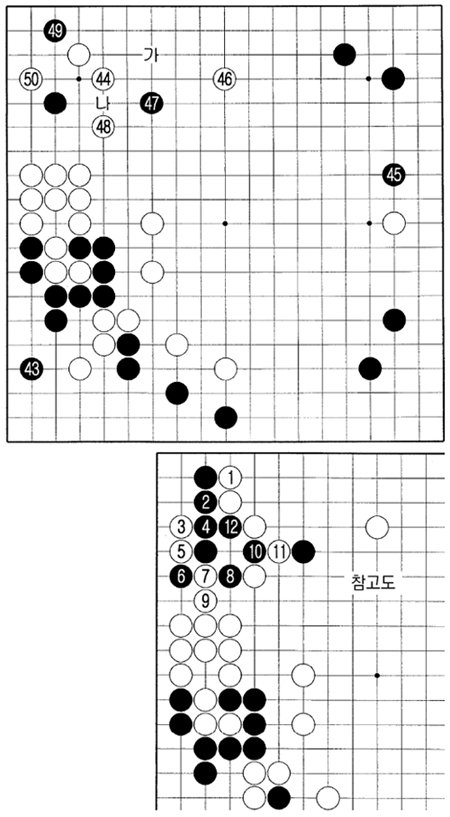 백 46은 당연한데 흑 47이 감탄을 부른 행마다. 백이 ‘가’로 받으면 ‘나’로 두어 전체를 살리겠다는 뜻. 백 48은 불가피하다.