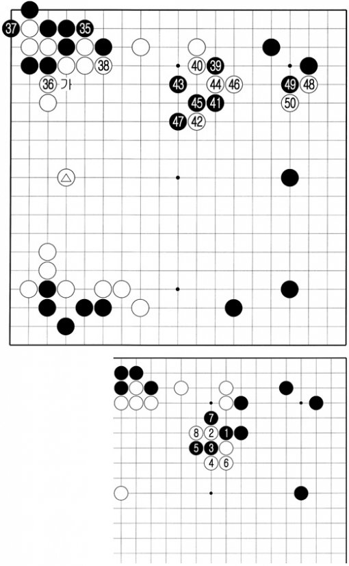 이 경우 백 36이 선수가 되지 않아 ‘가’로 젖혀 나오는 약점이 남는다. 이 같은 약점이 남으면 백이 하변 세력을 키우는 데 방해가 된다. 그래서 실리 손해를 감수하고 흑 35를 허용하는 대신 백 36을 선수한 것.