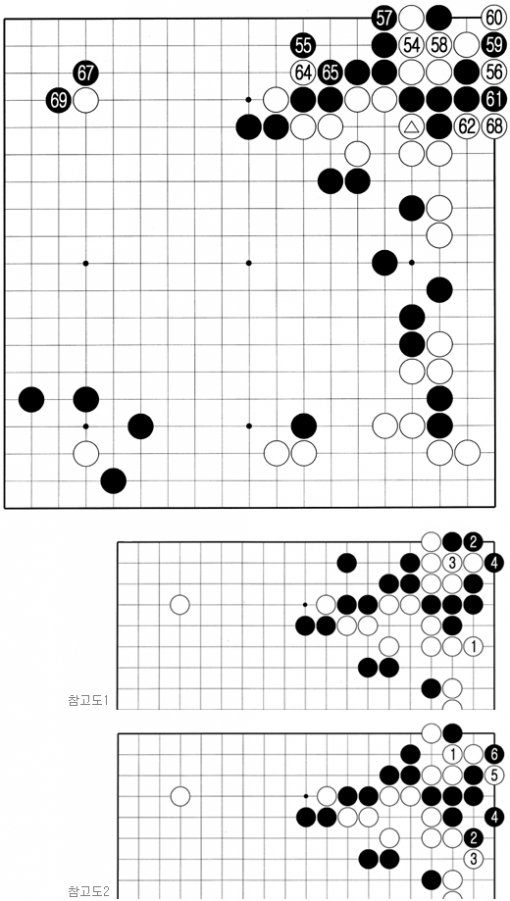 백 54는 당연한 수. 참고1도 백 1에 두기 쉬운데 흑 6까지 빅이 된다. 이 결과는 흑이 선수를 잡게 돼 백이 곤란하다.