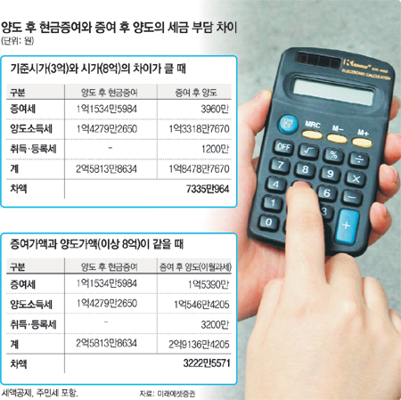 비슷해 보이지만 세금 부담이 달라지는 이유는 이렇다. 양도 후 증여하는 것과 증여 후 양도하는 것 모두 아버지의 취득가액을 기준으로 하기 때문에 양도세는 큰 차이가 나지 않는다. 증여 후 양도 방법은 양도세 계산 때 먼저 낸 증여세가 경비로 공제되기 때문에 오히려 유리하다.