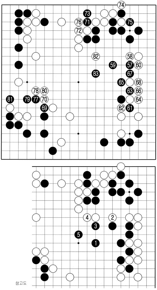 흑 83으로 고분고분 연결하지 않겠다는 자세는 당연한데 이 수가 의외의 실착이었다. 참고도처럼 뒀다면 흑은 쉽게 백 세력 안으로 들어갈 수 있었다. 백의 반격이 시작됐다.