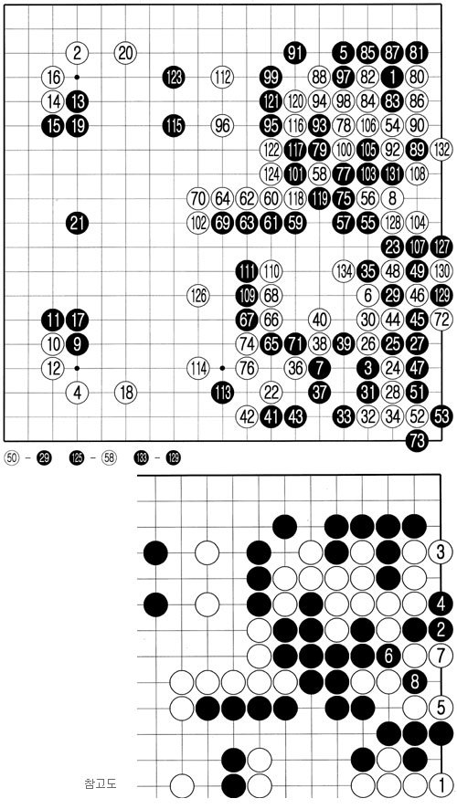 마지막으로 흑 127 때 128로 보강한 것은 정수. 패도 안 만들겠다고 참고도 백 1로 두면 흑 2로 한점을 뻗는 수가 있다. 흑 8로 먹여쳐 우변 백이 객사한다. 물론 참고도 정도는 목 9단 수준에선 한눈에 읽을 수 있는 수순. 지난해 도전자였던 목 9단은 첫판을 가볍게 이기고 8강에 진출했다. 50…29, 125…58, 133…129.