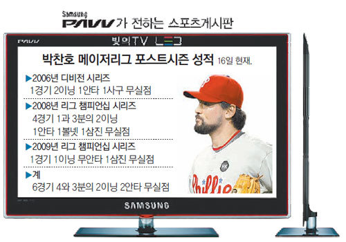 필라델피아 박찬호(36)가 메이저리그 데뷔 16년 만에 첫 포스트시즌 홀드를 따냈다. 박찬호는 16일 다저스타디움에서 열린 LA 다저스와의 내셔널리그 챔피언십시리즈 방문 1차전에서 5-4로 앞선 7회 무사 2루에 등판해 1이닝을 삼진 1개 포함해 퍼펙트로 막으며 승리를 지켰다. 최고 구속은 시속 154km가 나왔다. 필라델피아가 8-6으로 승리했다.