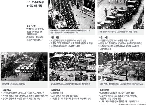 공수특전단을 앞세운 계엄군은 18일 광주 북구 용봉동 전남대 정문 앞에서 대학생들을 과잉 진압했다. 19일 계엄군은 광주 도심을 차단하기 위해 금남로를 봉쇄했지만 시민들이 늘어나 실패했다. 이날 첫 발포가 이뤄져 사망자가 속출했다. 21일 계엄군이 광주 외곽으로 빠져나가자 시민들은 무장했다. 고립된 상황에서도 나눔과 희생으로 시민들이 뭉친 ‘광주 공동체’가 생겼다. 하지만 계엄군이 27일 전남도청 ‘최후의 항쟁’을 진압하면서 5·18은 10일 만에 막을 내린다. 광주시는 “5·18 당시 사망자 및 행방불명자가 231명, 부상 후유증으로 나중에 숨진 사람이 100명에 이른다”고 밝혔다.