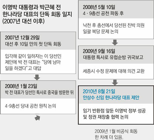 한나라당 안상수 대표가 지난달 16, 17일 양측에 회동을 제안하고 성사되기까지 진행 과정은 철저히 비밀에 부쳐졌다. 이 대통령은 협의 과정에서 오해가 생기지 않도록 정 수석이 직접 박 전 대표와 접촉하도록 한 것으로 전해졌다. 임태희 대통령실장도 회동 일정 협의에 깊숙이 관여한 것으로 알려졌다. 이 같은 직접 채널은 과거 주호영 특임장관과 박 전 대표 측 유정복 의원 간 채널을 대체한 것이다. 박 전 대표는 이번 회동을 마친 뒤 청와대를 나서며 정 수석에게 “정무수석님, 이번에 애 많이 쓰셨어요”라고 말했다고 한다.