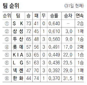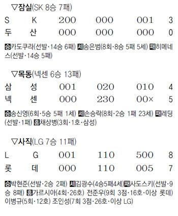 SK는 카도쿠라 켄의 호투 속에 두산을 3-0으로 이겼다. 선발 등판해 7과 3분의 1이닝을 4안타 무실점으로 막은 카도쿠라는 14승째를 거두며 양현종, 켈빈 히메네스 등과 다승 공동 3위에 올랐다. SK는 1회 박정권의 1타점 적시타와 김강민의 희생플라이로 2점을 선취한 뒤 9회 쐐기 득점까지 뽑아 승리를 마무리했다.