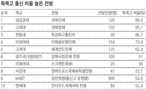 올해 이화여대 신입생 3378명 중 특목고 출신은 27%(911명)로 전체 대학 중 6위였다. 그러나 입학사정관 전형만 보면 이화여대가 특목고 학생 비율 1위가 된다. 입학사정관 전형으로 올해 이화여대에 들어간 452명 중 197명(46.4%)이 특목고 출신이었다.