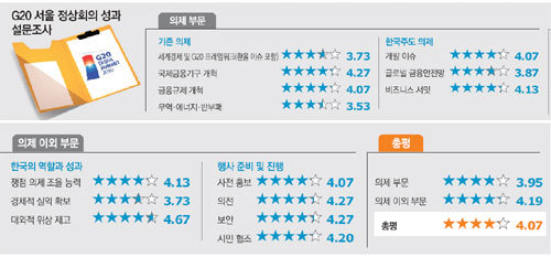 동아일보 경제부가 12일 G20 정상회의 합의문이 발표된 직후 경제 전문가 15명을 대상으로 이번 정상회의 성과에 대한 평가를 실시한 결과 전문가들은 7대 핵심의제에 대해 5점 만점에 평균 3.95점을 줘 대체적으로 성공적인 행사였다고 평가했다. 의제 중에서는 금융기구 개혁이 4.27점으로 가장 높은 점수를 받았고, 보호무역 저지를 포함한 무역·에너지·반부패와 환율 문제를 비롯한 세계 경제 및 G20 프레임워크(협력체계)는 각각 3.53점, 3.73점으로 평균 이하의 점수를 받았다.