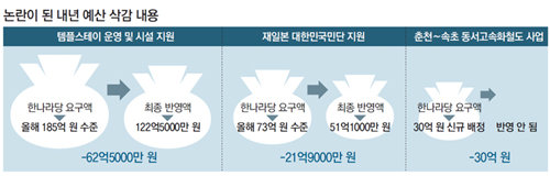 안상수 대표가 예산이 제대로 반영되지 않았다고 중점적으로 문제 삼은 사업은 △템플스테이 지원 △재일본대한민국민단 지원 △춘천∼속초 동서고속화철도 사업 등이다.
