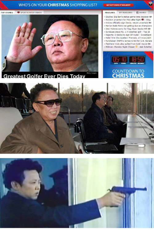 미국 스포츠 전문 케이블 채널 ESPN 홈페이지는 19일 김정일국방위원장의 사망을 두고 ‘가장 위대한 골퍼의 사망’이라고 풍자했다(위) ESPN 홈페이지, 2008년 11월 2일 김정일 국방위원장(가운데)이 조선 인민군 축구경기를 관람하는 사진. 야후스포츠는 김 위원장이 2010년 남아공월드컵 때 북한 대표팀 감독에게 일일이 작전을 지시했다고 보도했다(가운데) 평양=조선중앙통신 연합뉴스, 북한 조선중앙TV가 2007년 3월 17일 기록영화 ‘위대한 선군영도의 길에 함께 계시여’에서 김정일 국방위원장이 권총 사격 연습을 하는 장면을 방영했다(아래) 연합뉴스