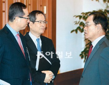 21일 청와대에서 열린 이명박 대통령과 7대 종단 지도자들의 간담회장에서 심각한 표정으로 얘기를 하는 청와대 참모들. 왼쪽부터 최금락 홍보수석비서관, 천영우 외교안보수석비서관, 하금열 대통령실장. 청와대사진기자단