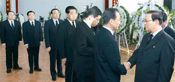 원자바오(溫家寶) 총리 등 중국 수뇌부가 21일 오전 베이징(北京) 주재 북한 대사관의 김정일 북한 국방위원장 분향소를 방문해 단체로 조의를 표시했다고 관영 신화(新華)통신이 이날 보도했다. 이로써 후진타오(胡錦濤) 국가주석을 비롯해 중국 공산당 서열 1∼9위인 상무위원 전원이 조문했다.