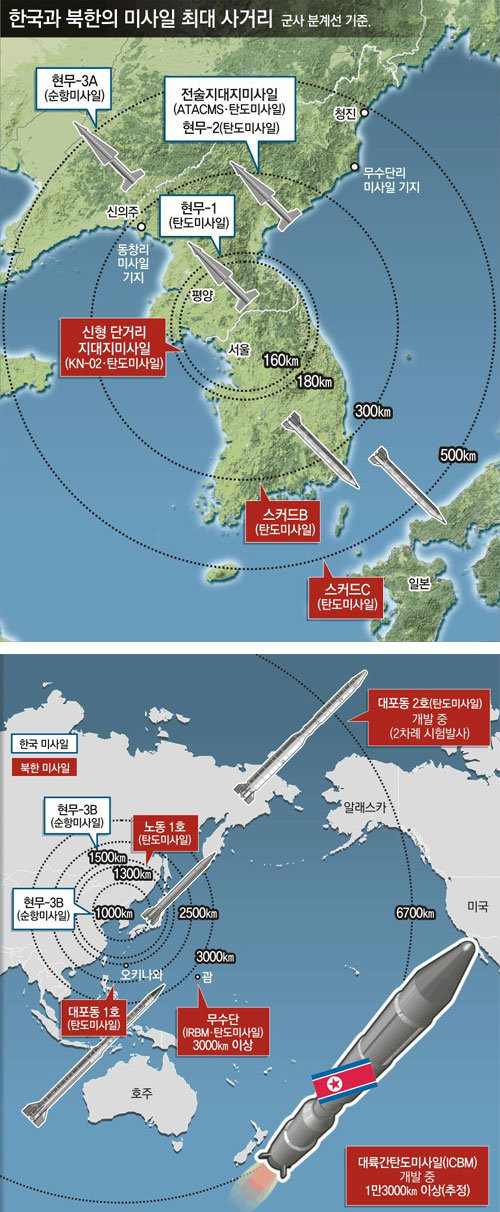 현재 군이 실전배치한 현무-1과 현무-2 탄도미사일의 최대 사거리는 각각 180km, 300km로 휴전선 인근에서 발사하면 평양과 신의주까지 도달할 수 있다. 북한이 다음 달 장거리로켓(광명성 3호) 발사를 예고한 평안북도 동창리 기지와 2009년 7월 중·단거리미사일을 무더기로 쏘아 올린 함경남도 신상리 기지, 강원도 깃대령 기지도 사정권에 들어간다.