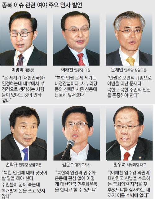 새누리당 대선주자인 김문수 경기도지사는 이날 서울 중구 한국프레스센터에서 열린 남북청년행동 긴급 좌담회에 참석해 이 의원을 향해 “북한의 인권과 민주화운동에 관심 없이 어떻게 대한민국 민주화운동을 했고, 인권운동을 했다고 할 수 있느냐”고 비판했다. 김 지사는 2005년 새누리당에선 처음으로 북한인권법을 발의했었다.