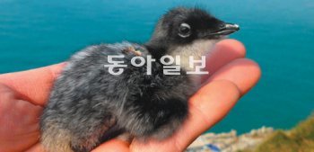 전남 여수시 삼산면 백도에서 발견된 멸종위기종 뿔쇠오리의 새끼. 섬 내 암벽 사이에 있던 알에서 부화된 것으로 추정된다. 국립공원관리공단 제공