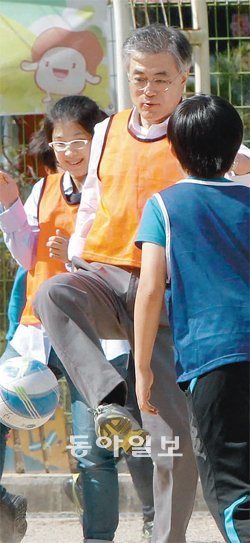 文, 초등학교로 민주통합당 문재인 대선후보가 8일 경기 성남 시 보평초등학교를 찾아 학생들과 축구를 하고 있다. 그는 이 학교 일일 보조교사로 강단에 서서 “아이들 행복을 가장 높은 가치로 생각하는 교육정책을 펴고 싶다”고 말했다. 성남=안철민 기자 acm08@donga.com