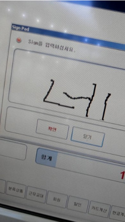 알바생을 웃긴 손님 사진에는 카드 결제시 사인하면 카운터에 있는 기기에 보이는 화면을 찍은 것이다. 즉 손님이 사인하는 모습이 카운터에 있는 알바생에게 그대로 보이는 것.