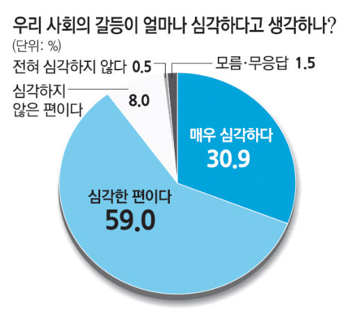 우리 사회의 갈등 정도에 대해서는 ‘심각하다’는 응답이 89.9%로 압도적이었다. 심각하지 않다는 응답은 8.6%에 불과했다. 연령이나 지역과 상관없이 우리 사회의 갈등 정도가 매우 심각하다고 느끼는 것으로 나타났다.