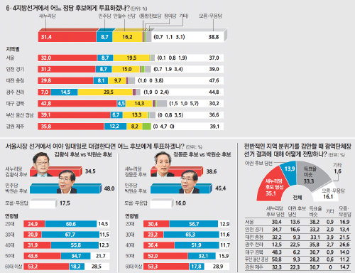 ‘어느 정당 후보에게 투표할 것이냐’는 설문에서 새누리당은 수도권(서울 32.0%, 인천·경기 31.2%)에서 안철수 신당(19.5%, 15.0%)과 민주당(8.7%, 8.7%)을 모두 앞섰다. 하지만 역시 부동층이 각각 37.0%, 39.0%로 새누리당 지지율보다 높아 예측하기가 쉽지 않다.
