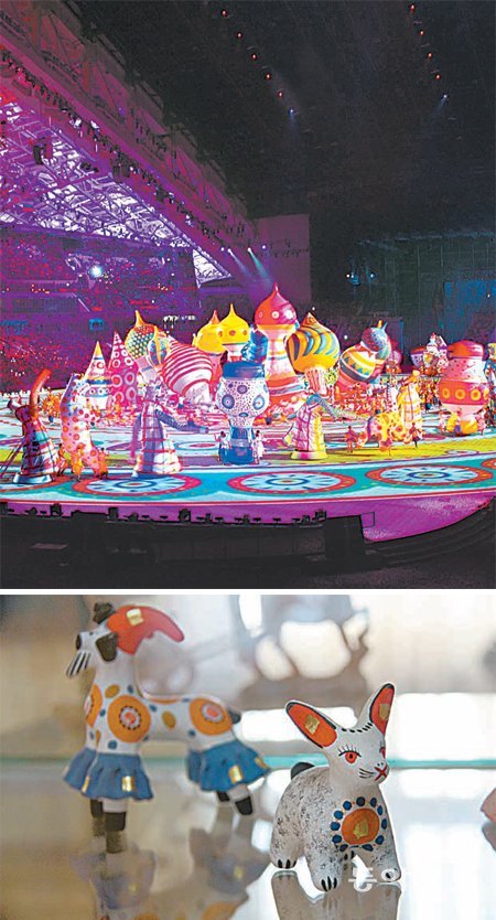 소치 겨울올림픽 개막식 중 ‘축제’ 장면에 등장하는 러시아 민속 축제 마슬레니차. 러시아 전통 장난감 딤코보에서 모티브를 땄다. 소치 시내에선 딤코보 전시(아래쪽)가 열리고 있어 개막식과 부대 문화행사를 연계했다. 유경숙 소장 제공