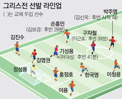 홍 감독은 포백라인을 교체 없이 풀타임을 뛰게 했다. 대체 카드가 마땅치 않았을 것이다. 당초 그리스전 엔트리에 올렸던 수비 자원 중 차두리(서울) 곽태휘(알 힐랄) 황석호(히로시마)가 부상으로 하차했다.