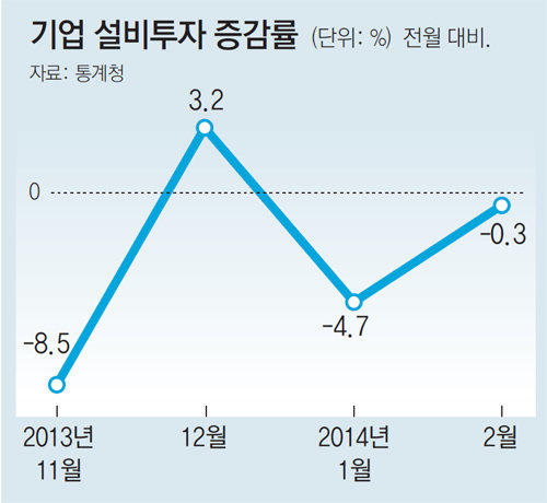 설비투자지수는 건물, 기계, 설비 등에 투자하는 기업의 투자액을 지수화한 것이다. 국내 설비투자지수는 2012년(―2.8%)과 지난해(―1.3%)에 2년 연속 하락했다. 현대경제연구원은 최근 보고서에서 2012년 4분기(10∼12월)부터 2013년 3분기(7∼9월)까지 1년 동안 국내 설비투자액이 적정 투자액보다 2조9213억 원이나 부족한 상태라고 진단한 바 있다.