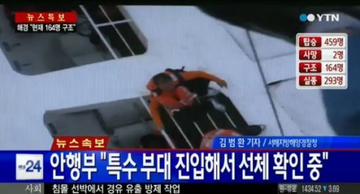 해경은 진도 해상 여객선 침몰 구조를 위해 나서 탑승자 중 164명을 구조했으며 현재 293명이 신원불명 상태이다.