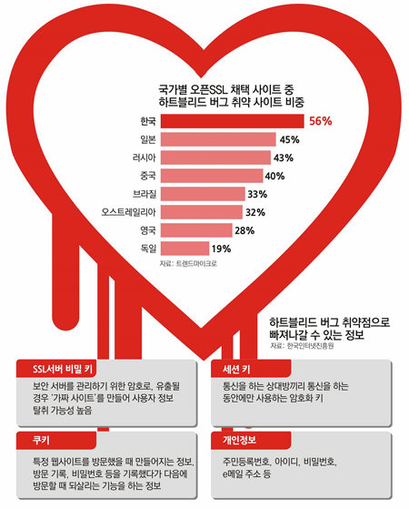 이런 상황에서 글로벌 보안업체들은 하트블리드 버그에 가장 취약한 나라가 한국이 될 것이라는 자료를 속속 내놓고 있다. 미국의 보안전문기업 ‘트렌드 마이크로’가 세계 주요 웹사이트 100만 개를 분석한 결과 ‘.kr’로 끝나는 한국 도메인의 경우 조사대상 사이트의 56%가 하트블리드 버그 취약점에 노출된 것으로 나타났다. 이는 세계 여러 나라 도메인 중 가장 높은 비율이다. 웹보안 전문회사 빛스캔의 전상훈 최고기술책임자는 “현재 국내 기업 상당수가 하트블리드의 심각성을 제대로 인식하지 못하고 있다”며 “취약점에 노출된 곳 대부분이 서비스 운영 중인데 서비스를 중단하고라도 당장 보안패치를 해야 한다”고 강조했다.