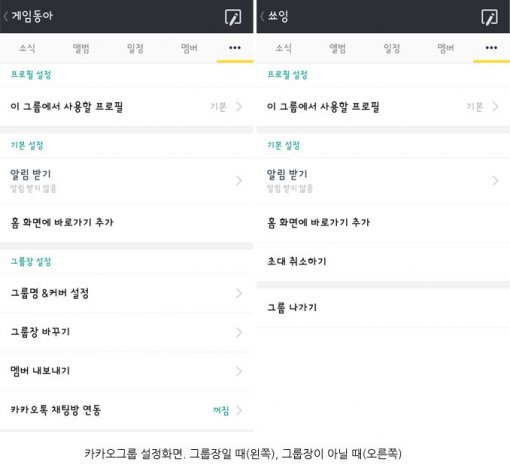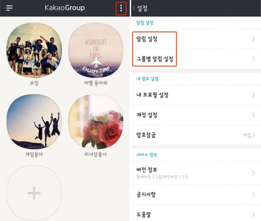 물론, 위에서 언급한 알림 설정은 모두 가능하다. 카카오그룹 첫 화면에서 오른쪽 상단에 있는 메뉴 버튼(… 모양)을 누르면 설정 메뉴로 진입할 수 있다. 여기서 '알림 설정'과 '그룹별 알림 설정'을 이용하면 된다.